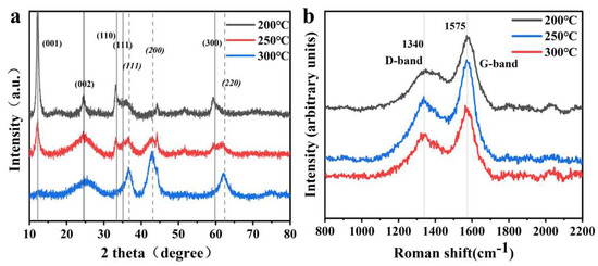 The physical phase composition of CNFs@Ni(OH)2/NiO-X was determined by X-ray diffraction (XRD) tests, and their XRD patterns were shown in Figure 2a. The characteristic peaks at 11.3°, 33.6°, 35.1° and 59.9° in the curves corresponded to the (001), (110), (111) and (300) crystal planes of Ni(OH)2, respectively (JCPDS: 22-0444). The characteristic peaks at 37.1°, 43.1° and 62.6° in the curves corresponded to the (111), (200) and (220) crystal planes of NiO, respectively (JCPDS: 89-7130). The characteristic peak at 24° in the curves was the (002) crystal plane of CNFs (JCPDS: 20-0018). The XRD patterns of CNFs@Ni(OH)2/NiO-X indicated that the characteristic peaks of CNFs@Ni(OH)2/NiO-200 were mainly in the Ni(OH)2 phase. With the increase in temperature, CNFs@Ni(OH)2/NiO-250 showed the co-existence of Ni(OH)2 and NiO characteristic peaks. With the further increase in temperature, the characteristic peaks of CNFs@Ni(OH)2/NiO-300 were mainly in the NiO phase. Therefore, it could be considered that as the calcination temperature increased, CNFs@Ni(OH)2/NiO-X surface-derived materials gradually overstepped from Ni(OH)2 to NiO because NiO was generated by the decomposition of Ni(OH)2 at high temperature. In the 250°C environment, Ni(OH)2 and NiO were in a co-existing state.