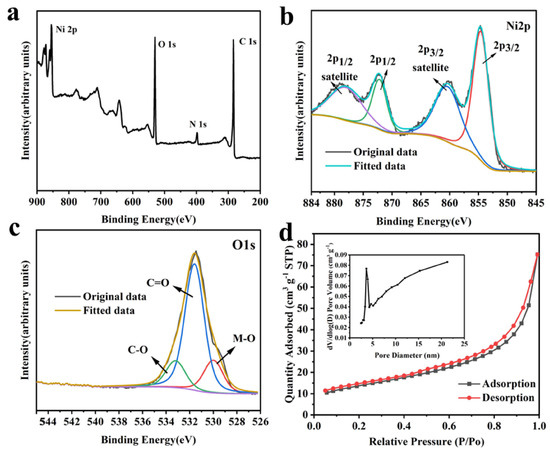 The chemical compositions and valences of CNFs@Ni(OH)2/NiO-250 were investigated by X-ray photoelectron spectroscopy (XPS), as displayed in Figure 5 and Figure S2. It could be found that CNFs@Ni(OH)2/NiO-250 contained C, N, O and Ni (Figure 5a). In its Ni2p XPS spectrum (Figure 5b), the binding energy of 854.5 ev versus 872.3 ev was attributed to the characteristic peak at Ni2p 3/2 versus Ni2p 1/2, which contributed to the redox reactions of +3 and +2 states of Ni(OH)2 and NiO in the electrochemical performance [19,20]. Compared with the characteristic peak at 855.6 ev for Ni2p 3/2 of pure Ni(OH)2, the characteristic peak was shifted to the right due to the partial production of NiO by calcination, while the characteristic peak for Ni2p 3/2 of pure NiO was at 853.7 ev. The characteristic peaks at binding energies of 860.5 ev and 878.3 ev were the satellite peaks of Ni2p 3/2 and Ni2p 1/2, respectively. The O1s XPS spectrum (Figure 5c) could be divided into three characteristic peaks, namely C-O (533.1 ev), C=O (531.5 ev), M-O (530.0 ev), and the C1s XPS spectrum (Figure S2) were also divided into three characteristic peaks, namely C-C (284.7 ev), C-O (286.1 ev) and C=O (288.5 ev).