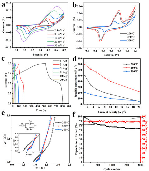 Figure 6 and Figure S3 showed the electrochemical properties of CNFs@Ni(OH)2/NiO-X. It was clear from the CV curves of CNFs@Ni(OH)2/NiO-250 at different sweep rates (Figure 6a) that there were obvious redox peaks, indicating that the redox reaction had a significant contribution to the capacitance of the composite [9,21]. The redox reaction was mainly related to Equations (5) and (6). Moreover, the CV curves of CNFs@Ni(OH)2/NiO-X at 5 mV s−1 sweep rate (Figure 6b) exhibited that all three composites had distinct redox peaks, and the CV curve area of CNFs@Ni(OH)2/NiO-250 was the largest, proving that the specific capacitance of CNFs@Ni(OH)2/NiO-250 was the largest.