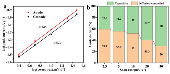 In Equation (7), if the b value is close to 0.5, the reaction mechanism is mainly the battery type where ion diffusion occurs. If the b value is close to 1, the reaction mechanism is mainly contributed by the capacitance. As shown in Figure 7a, the b-values of the anode and cathode were 0.549 and 0.529, respectively, which could be inferred that the reaction mechanism of CNFs@Ni(OH)2/NiO-250 electrode was a coexisting state of capacitive and battery-type charge storage mechanism. Figure 7b displayed that as the sweep rate increased, the diffusion-controlled contribution gradually decreased, and the capacitive contribution gradually increased. When the sweep rate increased from 2.5 mV s−1 to 30 mV s−1, the diffusion-controlled contribution decreased from 59.4% to 30%.