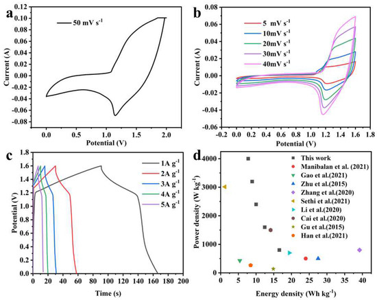 To determine a reasonable voltage window for CNFs@Ni(OH)2/NiO-250//AC ASC, its CV curve from 0–2 V at 50 mV s−1 was tested (Figure 8a). Based on the distribution of the maximum area of the CV curve, a voltage window of 0–1.6 V was finally selected for the ASC device. Figure 8b showed the CV curves of CNFs@Ni(OH)2/NiO-250//AC ASC at sweep rates of 5, 10, 20, 30, and 40 mV s−1. It could be seen from the curves that the ASC had a stable morphology at a voltage window of 1.6 V. Figure 8c displayed the GCD curves of ASC at 1, 2, 3, 4, and 5 A g−1 were basically symmetrical, indicating that ASC has good electrochemical reversibility. According to the GCD curves, the specific capacitances of CNFs@Ni(OH)2/NiO-250//AC ASC at 1, 2, 3, 4, 5 A g−1 were 46.5, 35, 28.1, 25, and 21.9 F g−1, respectively, and its energy density versus power density curve was plotted to evaluate its energy storage performance, as shown in Figure 8d. It could be found that CNFs@Ni(OH)2/NiO-250//AC ASC had an energy density of 7.78 Wh kg−1 at a maximum power density of 4000 W kg−1 and a power density of 800 Wh kg−1 at a maximum energy density of 16.56 Wh kg−1. The energy density and power density of the CNFs@Ni(OH)2/NiO-250//AC ASC device was compared with the data already reported [15,16,27,28,29,30,31,32,33], as shown in Figure 8d.