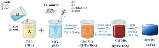Resorcinol-formaldehyde (RF, 99% purity, China National Pharmaceutical Group Corp., Beijing, China) was selected as the carbon source, and tetrabutyl titanate (TBOT, ≥99% purity, Aladdin, Shanghai, China) was the titanium source. For the RF (resorcinol-formaldehyde)/Fe sol, 0.001 mol Fe source, 0.05 mol of resorcinol, 0.2 mol of formaldehyde solution (37 wt·%), 25 mL of ethanol, and 1.8 mL of dilute hydrochloric acid were mixed in the beaker within 15 min. For the TiO2 sol, solution A (0.05 mol of tetrabutyl titanate and 40 mL of ethanol) and solution B (40 mL of ethanol, 3.6 mL of deionized water, and 1 mL of nitric acid) were mixed within 10 min. The two sols were then homogenously mixed to carry out the sol–gel process, and the wet gels (RF/Fe/TiO2) were prepared. The resulting RF/Fe/TiO2 gels were washed with ethanol at 50 °C for 3 days to obtain the alcogels. The alcogels were dried with the technique of supercritical CO2 drying (SCD) to prepare the RF/TiO2 aerogels. Then, the as-prepared aerogels were thermal-treated at 900 °C and held for 5 h to partially reduce N2 flow (100 mL·min−1) with a heating rate of 2 °C·min−1. The Fe sources were Fe(NO3)3·9 H2O (99% purity, Shanghai Bailingwei, Shanghai, China), C15H21FeO6 (98% purity, Aladdin, Shanghai, China), K4Fe(CN)6·3 H2O (98% purity, Sigma-Aldrich, St. Louis, MO, USA), and Fe3O4 (98% purity, Aladdin, Shanghai, China), and the as-prepared aerogel catalysts were denoted as TA/Fe1, TA/Fe2, TA/Fe3, and TA/Fe4, respectively. The synthesis process of the TA/Fes is illustrated in Figure 1.