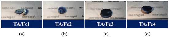 The photographs of the titanium oxide aerogels doped by different Fe sources after heat treatment are shown in Figure 2. The color on the surface of the TA/Fe1 and TA/Fe2 distinctly exhibited the blue color, while the surface of the TA/Fe3 and TA/Fe4 with a very minimal blue and light brown were generally black. The color change indicated the transformation of the crystalline phase.