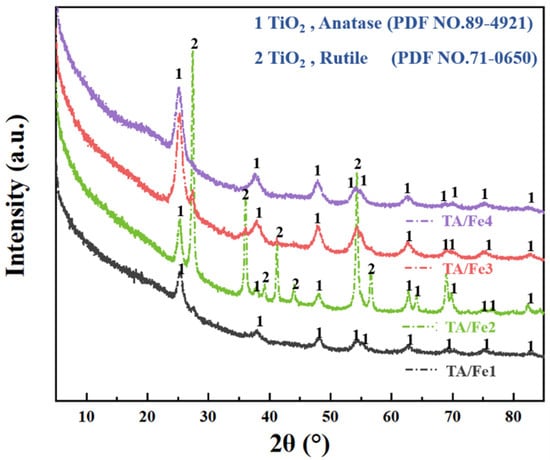 XRD (X-ray diffraction) analysis was applied to further confirm the phase change of the aerogels. As Figure 3 shows, both anatase (PDF NO.89-4921) and rutile (PDF NO.71-0650) existed in the TA/Fe2, which suggested the appearance of the mixed crystalline phase. In the TA/Fe1, TA/Fe3, and TA/Fe4, only the anatase was formed.