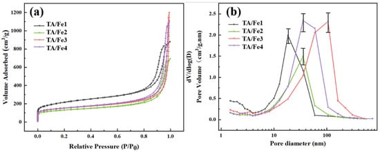 (a) N2 adsorption/desorption curves and (b) pore size distribution of the TA/Fe1, TA/Fe2, TA/Fe3, and TA/Fe4.