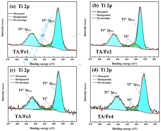 Ti 2p XPS spectra of the titanium oxide-based aerogel catalysts doped by different Fe sources: (a) TA/Fe1, (b) TA/Fe2, (c) TA/Fe3, (d) TA/Fe4.
