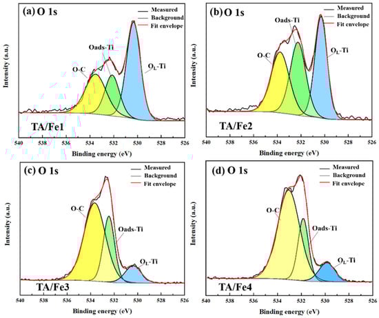 O 1s XPS spectra of the titanium oxide-based aerogel catalysts doped by different Fe sources: (a) TA/Fe1, (b) TA/Fe2, (c) TA/Fe3, (d) TA/Fe4.