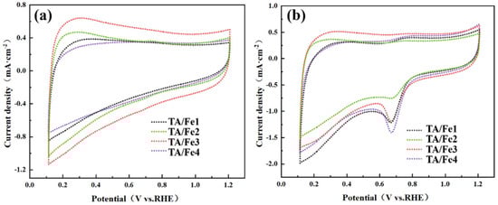 CV (cyclic voltammetry) was first used to evaluate the ORR catalytic performance of the materials. The titanium oxide-based aerogels doped by different Fe sources are shown in Figure 8. It can be found that no cathodic peak concerning oxygen reduction was found in the nitrogen test atmosphere (Figure 8a). On the contrary, the cathodic peaks were observed in all aerogel catalysts under the oxygen test atmosphere, confirming the reaction of oxygen reduction (Figure 8b). The high peak current and high peak potential possess better ORR catalytic activities. The TA/Fe4 presented the largest peak current of 1.41 mA·cm−2 and the TA/Fe2 had the smallest peak current of 0.74 mA·cm−2. However, the latter exhibited a higher peak potential of 0.68 V.