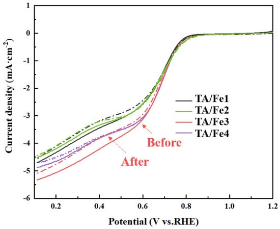 A further characterization of the ORR catalytic performance was carried out using LSV (linear weep voltammetry), as shown in Figure 9. The TA/Fe3 had the highest limiting current density (Jlimit) of 5.34 mA·cm−2, which was close to the commercial Pt/C (5.55 mA·cm−2), while the TA/Fe2 showed the lowest current density of 4.51 mA·cm−2. Still, the values of Jlimit were higher than their counterparts due to the high specific surface area and large pore volume, which was conducive to the exposure of active sites and mass transfer. Anatase is octahedrally distorted due to octahedral mismatch, which also leads to the occurrence of oxygen vacancies and structural defects. Compared to anatase, the rutile crystalline structure with fewer defects is more stable. Therefore, the electrical conductivity of anatase is better than that of rutile. In the TA/Fe2, two crystal structures appeared simultaneously, i.e., mixed crystals. The formation of a large amount of rutile reduced the electrical conductivity of the material, thus hindering the electron transfer. The stability was evaluated by comparing the difference in the half-wave potential (ΔE1/2) of the LSV curves before and after 1000 CV cycles. The ORR catalytic performance data are shown in Table 3. It was not difficult to find that all samples exhibited high electrochemical stability.