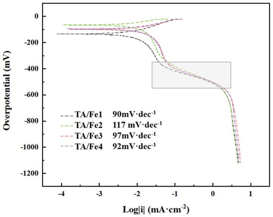 Tafel slope was used to describe the reaction kinetics of ORR, as shown in Figure 10. A smaller Tafel slope indicated a smaller transfer resistance; hence, the reaction occurred easily. From the data in the figure, it can be seen that the performance of the organic iron-doped sample (Fe2) is inferior to that of the inorganic iron sources. This could be explained by two reasons. The first was due to the lowest pore volume and specific surface area, which hindered the mass transfer. The second was the deterioration of the electrical conductivity due to the formation of large amounts of rutile.