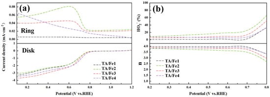 The transfer number (n) and hydrogen peroxide yield (HO2−) were evaluated by potentiostatic polarization, as shown in Figure 11. The TA/Fe1 had the lowest HO2− yield in the potential range of 0.2–0.8 V; however, the TA/Fe2 were higher than the others. Nevertheless, all samples showed the 4e− transfer pathway.