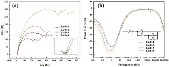The EIS (electrochemical impedance spectroscopy) test was used to evaluate the impedance during the electrochemical reaction, as shown in Figure 12. From high frequency to low frequency, the electrons were transported from the surface to the inside of the catalysts. A corrosion medium/corrosion product/metal fitting circuit was used. The equivalent-circuit model had five parameters including Rs, R1, C1, Q1, and Rct, which referred to the solution impedance, the corrosion product coating impedance, the electrolyte/corrosion product coating interface capacitor, the corrosion products/metal interface capacitor, and the charge transfer impedance, respectively. The fitting data are provided in Table 4. The Rs is related to the electrolyte and the geometry of the test cell, rather than the characteristics of the catalysts. Therefore, the Rs is generally used for the IR compensation. Rct is the crucial parameter concerned with the resistance of the electrochemical reaction, with low Rct favoring the electron transfer. The Rct of PRTA/Fe1-900N, PRTA/Fe2-900N, PRTA/Fe3-900N, and PRTA/Fe4-900N were 444.4 Ω, 828.2 Ω, 497.8 Ω, and 313.3 Ω, respectively. Since rutile in the TA/Fe2 is the stable form of TiO2 compared to anatase, which leads to the differences in their electronic structures and forbidden bandwidths, the differences in electrical conductivity and catalytic activity appeared. The Rct values of the as-prepared aerogel catalysts were smaller than the research that has been reported on TiO2, which also illustrated that the doping influenced the electrical conductivity by introducing an impurity level in the bandgap and thus enhancing the electron transfer. In addition, a larger pore volume and a larger median pore size were more favorable to the mass transfer and lowered the reaction impedance, which improved the catalytic activity of ORR.
