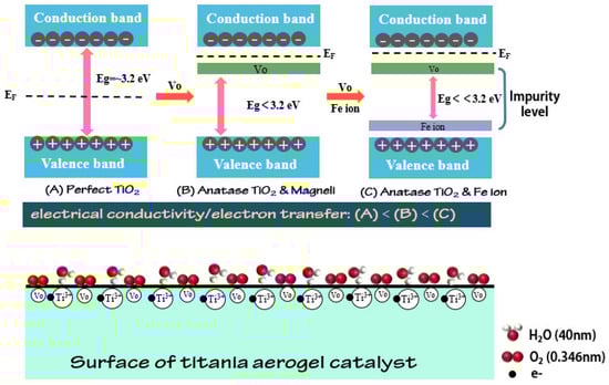 Fe-doped titanium oxide-based aerogel catalysts had better electrical conductivity and ORR catalytic activity due to the impurity levels of oxygen vacancies and Fe ions. In addition, the ORR catalytic performance of the TA/Fe3 were better than those of the undoped materials (initial potential (0.80 V), half wave potential (0.71 V), highest limiting current density (4.84 mA·cm−2), stability of electrochemistry (1.2 mV), and Tafel slope (70 mV·dec−1)) []. The formation of oxygen vacancies, which was proved by the XPS characterization, would serve as donors. The Fe ions in the materials would serve as either donors or acceptors, depending on the form of the metal atoms in the lattice. When a metal atom replaced a lattice atom, a donor level was created; if a metal atom formed as interstitial, an acceptor level appeared. Either way, the bandgap would be narrowed which improved the electrical conductivity, thus lowering the electron transfer resistance. What is more, the oxygen adsorption energy barrier would be reduced due to the formation of oxygen vacancies, changing the oxygen-related descriptors [,]. Moreover, the O2 could be easily absorbed by the oxygen vacancies, improving the reaction kinetics. Moreover, since the molecule size of H2O is 40 nm and for O2 is 0.345 nm, it is important to ensure that each reactant can reach the active sites easily. The higher pore volume and the median pore size close to the molecule size of H2O would improve the catalytic performance. Therefore, micropores facilitated the transport of electrons and gas molecules, and meso- macropores facilitated rapid mass transfer (Figure 13).