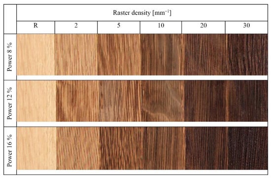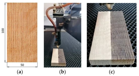 The technology of material treatment using laser irradiation has met a wide range of applications in cutting and surface treatment of metallic and non-metallic materials, including wood and wood-based ones [1,2,3,4,5,6,7,8,9]. At present, considerable attention is devoted to studying the performance of surfaces engraved with CO2 lasers, aiming for purpose-oriented changes to wood structure and properties [6,8,10,11,12,13,14,15,16,17,18,19,20].