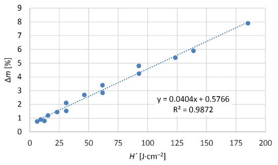 The values H´ of the irradiation dose delivered over a unit area were calculated according to Equation (2), with parameters expressing conditions for the relevant CO2 laser irradiation. These results are listed in Table 1. The total irradiation dose ranged from 6 to 185 J∙cm−2, with the lowest value obtained at the minimum (8%) laser power and the lowest raster density (2 mm−1), and the highest at the respective values of 16% and 30 mm−1.