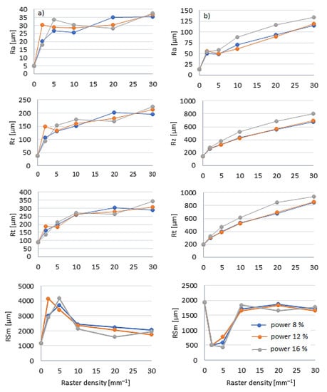 Roughness parameter values Ra, Rz, Rt, and RSm in engraved oak wood specimens, dependent on the raster density values, at raster power of 8, 12, and 16%—(a) parallel to grain, (b) perpendicular to grain.