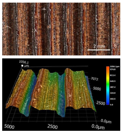 The roughness was measured on the irradiated radial surfaces, parallel with and perpendicular to the grain. The roughness evaluation started by filtering off the waviness from the basic profile, and then the roughness curve was transferred onto the basic line. The entire transverse length consisted of run-up segment lr, five sampling length (cutoff) segments λc, and the over travel segment; lp. The basic lines were chosen from the interval 0.025–8 mm, based on the preliminary measured roughness parameters Ra and Rz. For studying the structure of the engraved oak wood surfaces, a light microscope Leica MZ 9.5, camera Leica EC3 was used, and a digital microscope Keyence VHX 7000 (Keyence International, Mechelen, Belgium). Microscopic slides of the transverse cuts were prepared following the methods described in [12].