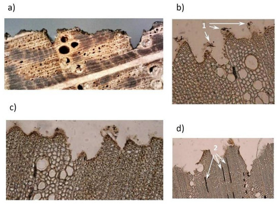 Oak wood is ring-porous, with early wood vessels having big lumens and thin cell walls, and with libriform fibres exhibiting small lumen diameters and thick cell walls. The roughness profiles measured perpendicular to the fibre course in the radial direction were affected by cell wall degradation, especially in early wood vessels. This resulted in forming deeper depressions in such spots. The paper [12] suggests that the same is true in the case of irradiated tangential surfaces, which is evident on the microscopic slides in Figure 5b–d. If the irradiated oak wood surfaces exhibit dominant tangential shares, the heat supplied onto the surface during engraving penetrates deeper into the wood through its pith rays. The pith rays are composed of parenchyma thin-walled cells that under heat impact degrade easily, up to carbonisation. The carbonised cells in micro-cuts are evidenced as black strips (Figure 5b–d).