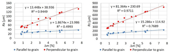 In the engraved specimens, the roughness parameter values Ra, Rz, and Rt parallel to the grain significantly increased with increasing laser power, and mainly with increasing raster density. At the maximum laser power and the maximum raster density, the roughness parameter increase was several-fold. The roughness parameter values RSm, parallel to the grain, increased with increasing raster density as far as 5 mm−1; there followed a moderate decrease (Figure 3).