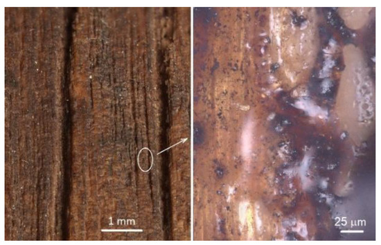 Surface of oak wood engraved with a CO2 laser at laser power of 16 % and raster density of 30 mm−1. Left: radial surface with obvious trenches in early wood. Right: melt layer topping the engraved surface—detail.