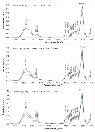 FTIR spectra were measured on the native wood surface and the surface engraved with CO2 laser (for used raster densities of 10, 20, and 30 mm−1). All the spectra were evaluated altogether, as the differences between them were small. We can see (Figure 8) that the variance in the band from 3100 to 3600 cm−1 was minimum. This very broad peak has been assigned to the O−H vibrations in the lignin structure, in cellulose fibres, and in hemicelluloses [43]. The changes in the band absorbance with a peak at 3350–3360 cm−1 could be observed at all three laser power values used. Increasing absorbance was especially evident for lower raster density values; conversely, at higher raster densities, the absorbance decreased. This phenomenon may be backed-up with a higher rate of splitting the O−H bonds in the molecules of the water bound to the wood, due to higher amounts of the energy supplied [44]. The interval from 2900 to 2850 cm−1 (symmetric and asymmetric C−H stretching vibrations in aliphatic compounds) [45] exhibits similar effects, however, with lower variance in the absorbance density values.