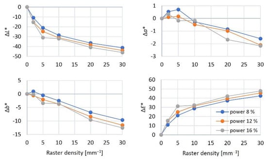 Raster density-dependent values of colour coordinates ΔL*, Δa*, Δb* and total colour difference ΔE* at varying CO2 laser power.