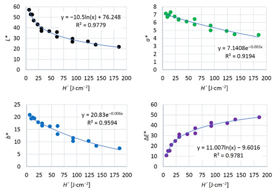 The impacts of the changes in the individual colour coordinates on the total colour change ΔE* are illustrated in Figure 9. Just at the minimum laser power (8%) and the minimum raster density (2 mm−1), the ΔE values calculated using Equation (7) ranged from 9 to 12, corresponding, according to the six-degree scale proposed by [33], to the degree five, expressing an easily visible change in relation to the original colour. With grading the laser power and raster density, the total colour difference values were far beyond 12, corresponding, in accordance with the reported scale, to the total new colour compared to the original. Qualitatively, these changes were like the ones reported by [10,11,16,20,24]. Quantitatively, our results were different, as we studied discolouration on different wood species and under varying laser parameters (head movement rate, focal distance and similar). This fact was an incentive for exploring the dependence of colour change on the total irradiation dose. The result was finding that all the radiation parameters (laser power, head movement rate, focal distance, and raster density) significantly influencing irradiation energy and wood colour could be substituted with a single variable H´, representing the total irradiation dose. The detected dependences of colour coordinates and total colour difference on irradiation dose are displayed in Figure 11. The results confirmed a strong dependence on the discussed colour coordinates on the total irradiation dose.