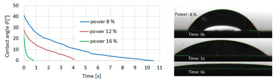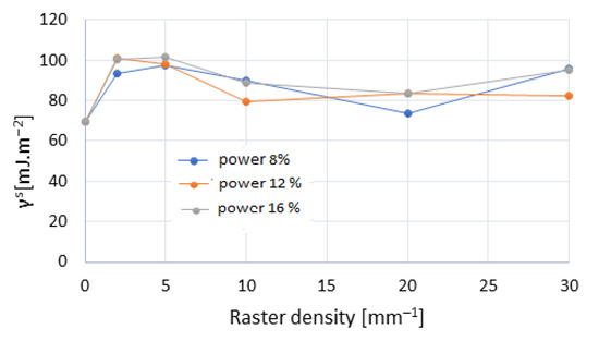 Compared to the original oak wood surfaces, the engraved ones demonstrated much better wettability with both testing liquids. The results for oak wood wetted with water and diiodomethane are summarised in Table 3. Figure 12 illustrates the variability of the contact angles during the wetting process at a raster density of 20 mm−1, at all three laser power values. Each curve in the graph represents one particular characteristic measurement corresponding to the maximum contact angle at the moment of drop application onto the surface for the relevant treatment way. In many cases, the observed wetting was perfect, equally for water and for diiodomethane. This fact was also reflected in significantly higher values of surface free energy (Figure 13), ensuing from increased disperse and polar components (Table 4). These results are opposite to the results reported in [22], the authors of which observed enhanced hydrophobicity on pine wood surfaces treated with CO2 laser. The authors report pine wood surface temperature reaching up to 200 °C, without the surface carbonisation. The work [59] reports a significant increase in hydrophobicity of a heat-treated beech wood surface at 200 °C, which was reflected in contact angle values bigger than 90°. Worsened wetting of heat-treated modified beech wood was also observed by other authors [60,61].