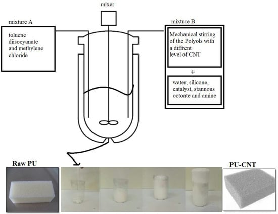 - The chemical components are incorporated in a given order (mixture A: 7.4 g of toluene diisocyanate (TDI) and 0.65 g of methylene chloride, mixture B: 10 g of polyol is thoroughly mixed with different weights of CNT for 15 to 20 s. 0.8 g of water, 0.2 g of silicone oil, 0.16 g of triethylenediamine, and 0.03 g of stannous octoate are mixed for 15 s at an agitation speed of 1000 rpm in a mixer (Figure 1).