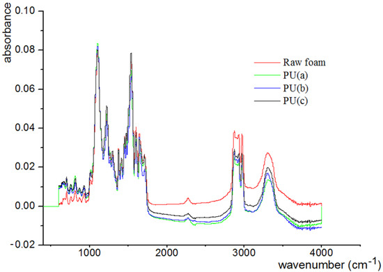 Both spectra presented in Figure 6 show that the loading of the PU–CNT treatment does not lead to any secondary reaction; only the characteristic peaks of the matrix and the charges do appear.