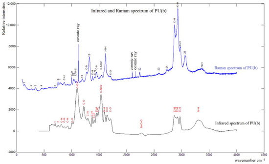 As an example, the Raman and IR spectra of PU(b) were compared (see Figure 6) to obtain more information about new functions and secondary reactions.