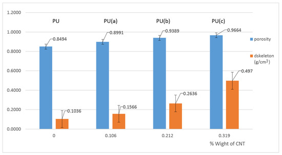 It can be noted that porosity and density increase with carbon nanotube content. For a higher CNT content, the porosity increases significantly from about 90% to 94% and 97% for 0.106, 0.212% and 0.319 wt.% of CNTs, respectively.