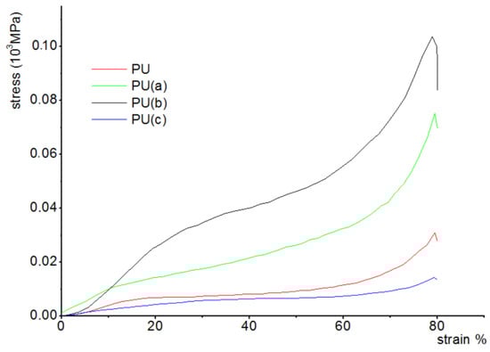 Stress–strain curves for the CNT–PU composites studied with 80% strain at a 5 mm/min speed.
