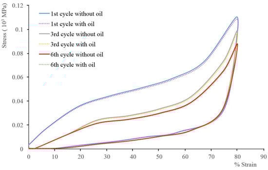 The reusability of the prepared PU sponges after pressing them to exude oil was also tested in this work [51]. The sorption–desorption cycle investigation shows that approximately only 1.5% could not be desorbed (Figure 12), which pleads for the possible use of the prepared samples for petroleum spill cleanup.