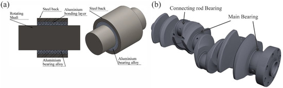 Due to their high mechanical and good tribological properties, lead, and tin-lead bronzes remain the most frequently used material for journal bearings. In addition, friction forces and their effects consume approximately 23% of the world’s energy today [1,2,3]. Due to the substantial cost savings associated with bearing production and subsequent maintenance, the transition from bronze to aluminum-based alloys has become a driver for the engine-building industry’s development [4]. Compared with copper-based alloys, aluminum-based alloys are three times lighter, 2.5–2.7 times cheaper, easier to process and manufacture, and require less energy to cast than copper by 15–20%. Aluminum, unlike bronze, does not act as a surfactant on steel and does not attack it through the Rehbinder effect [5]. As a result, further chemical-thermal treatment of steel shafts can be avoided when using aluminum-based anti-friction bearings, and thus anti-friction alloys have gained significant interest [6,7,8,9,10]. Figure 1 demonstrates the construction of Al-metal bearing shells, as well as their constructions and positions on the crankshaft, as one example of the various uses of metal bearings. The aluminum anti-friction bearing shell is assembled on the steel back substrate using the aluminum bonding layer (Figure 1a). The anti-friction bearing alloys were developed to fulfill various requirements such as good mechanical properties, high corrosion and wear resistance, excellent thermal conductivity, and lubricity, and they should be cost-effective materials [11,12,13]. Figure 1b shows the positions of the bearing on the crankshaft and the bearing construction used in the modern high-speed internal combustion engine [14]. Any bearing material must have high compressive strength and fatigue resistance to prevent permanent deformation and the formation of permanent deformation and forming surface fatigue cracks.