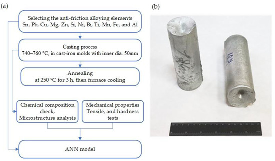 Figure 2a depicts the schematic flow chart of this work, including the preparation and casting of the proposed alloy, the characterization step (microstructure and mechanical characterization), and the creation of the ANN model. In the current study, 198 Al-based alloys containing Sn, Pb, Cu, Mg, Zn, Si, Ni, Bi, Ti, Mn, and Fe elements were investigated. The content of the elements varies within the limits tabulated in Table 1. Pure Al (99.95), Sn (99.90), Pb (99.985), Bi (97), and Zn (97.5) were used for sample casting (all numbers are in wt%). Master alloys of Al-20Cu, Al-15Ni, Al-10Cu-10Ni, Al-10Si, and Al-12Mg were used to incorporate Cu, Ni, Si, and Mg elements. The master alloys were initially prepared from Al with mono metal Cu (99.90), Ni (99.7), Si (98.8), and Mg (99.95). According to the Russian standard, GOST (11069, 860-75, 3778-98, 10928-90, 3640-94, 859-2014, 849-2018, 2169-69, and 804-93), the purity of the alloying elements and the amount of the elements in master alloys were selected [39], as well as the binary phase diagram of each master alloy. Ti was added into the melted alloys in the form of salts hexafluorotitanic and hexachloroethane as part of the degasser-modifier “Zernolit-2” [40,41].