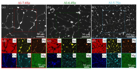 The SEM-BSE microstructures (a–c) and corresponding EDS-maps (d–f) of the investigated alloys: (a,d) Al-7.6Sn, (b,e) Al-6.4Sn and (c,f) Al-5.7Sn.