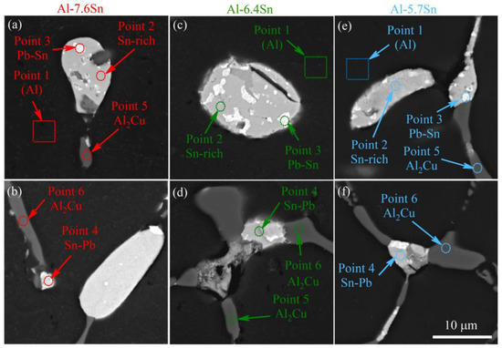 The BSE-SEM microstructures of the (a,b) Al-7.6Sn, (c,d) of the Al-6.4Sn, and (e,f) of the Al-5.7Sn alloys. The EDS spectra and chemical compositions of the analyzed points are presented in Figures S1–S3 in Supplementary data.