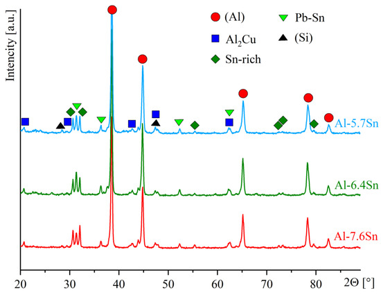 The Al-6.4Sn and Al-5.7Sn alloys exhibit a similar microstructure to Al-7.6Sn alloy: a dendritic cell structure with a size ranging from 15–115 μm for Al-6.4Sn alloy and 10–75 μm for Al-5.7Sn alloy (Figure 4b,c). The element distribution maps (Figure 4e,f) also indicate the presence of the Al-solid solution, the soft structural inclusions of Sn-and Pb-rich phases (Sn-rich, Sn-Pb, and Pb-Sn phases), the solid phases inclusions of Al and Cu-rich phase (Al2Cu) and a small fraction of the (Si) phase. The presence of these phases was confirmed by XRD-analysis (Figure 6). The soft and solid phase inclusions have a shape and distribution similar to the Al-7.6Sn alloy. For both alloys, the predominant structure of the soft inclusions is the globular shape ranging in size from 3 to 15 μm. In addition, there are a small number of elongated inclusions with a thickness of 2–4 μm and 3–5 μm and a length ranging from 9 to 41 μm and from 10 to 18 μm for the Al-6.4Sn alloy and the Al-5.7Sn alloy, respectively. The solid inclusions of the Al2Cu phase are mainly located along the dendritic cell boundaries and have an elongated shape (the thickness ranged from 2 to 5 μm for the Al-6.4Sn alloy and from 2 to 4 μm for the Al-5.7 alloy, respectively). The length of the solid phases usually does not exceed 50 μm for the Al-6.4Sn alloy and 38 μm for the Al-5.7 alloy. The EDS point analysis of the investigated Al-6.4Sn and Al-5.7Sn alloys (Figure 5c–f) also indicates the presence of the structural components: the Al-solid solution with copper, zinc, and silicon, soft phase inclusions with Sn and Pb (Sn-rich, Sn-Pb, Pb-Sn phases), and solid inclusions of Al2Cu phase. The detected phases’ chemical compositions and corresponding EDS-spectrums of the Al-6.4Sn and Al-5.7Sn alloys are presented in Figures S2 and S3.
