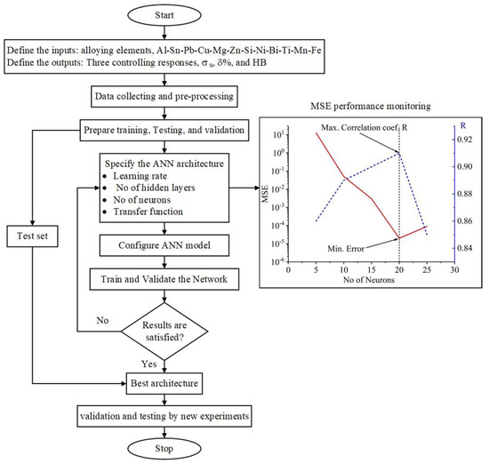 Though the ANN is widely and effectively used in modeling the behavior of materials, from the literature, there is a huge knowledge gap in using the ANN for predicting the mechanical properties of anti-friction aluminum-based alloys. In this context, this work aims to: (1) Provide an accurate ANN architecture for predicting the mechanical properties of the anti-friction aluminum-based alloys (alloying elements: Sn, Pb, Cu, Mg, Zn, Si, Ni, Bi, Ti, Mn, and Fe) without performing extra experiments, thereby saving the time, effort and materials, and reducing the overall cost. (2) Understanding the impact of soft phases and the solid strengthened phases on the mechanical properties of these alloys. The soft inclusion elements provide the desired tribological properties, while the hard inclusion elements provide the required level of mechanical properties. It should be noted that this work is part of a more significant effort to replace bronze-based bearing materials with aluminum-based anti-friction alloys [26,27,38]. Consequently, the additional elements were selected considering the aim of this series of work, achieving good tribological properties with an acceptable level of mechanical properties without softening and failure. The ANN for modeling and prediction of the mechanical properties of such huge alloys is a feasible study for time and material saving, and to our knowledge, such a study has been performed here for the first time.