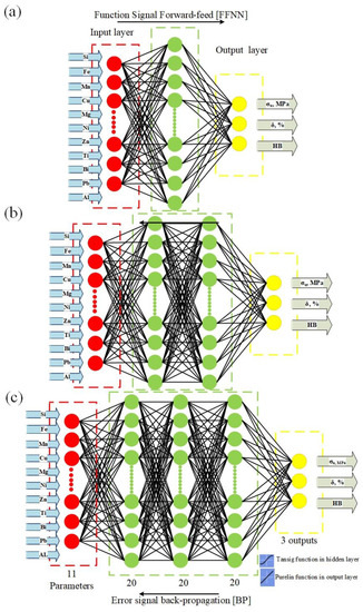 In the present work, the chemical compositions of the added elements (Fe, Si, Mn, Mg, Cu, Ni, Ti, Zn, Bi, Pb, and Sn) of the investigated alloys were selected to be the inputs, and the tensile strength (MPa), elongation to failure (%), and HB were set as the outputs control responses. There were numerous trials, including attempting one, two, and three concealed layers. In addition, various numbers of neurons were tested in each hidden layer. It is well known that the influence of the number of neurons in hidden layers on the output of a network is complex. If the design of the model is overly simplistic, the trained network will not be able to correctly learn the process and determine the relationship between input and output variables. Alternatively, it may fail to align during training, or the training data may be overfitted. Consequently, various network structures in the hidden layer with varying numbers of neurons were investigated. Figure 7 shows the flow chart of the implemented ANN model. The trial-and-errors strategy was launched with one neuron in the hidden layer and progressed with additional neurons to determine the optimal number of neurons. Figure 6 demonstrates how the number of neurons in one hidden layer affects the proposed network’s effectiveness, tested using mean square error (MSE) and correlation coefficient (R) indicators. The MSE was lowest when the number of neurons was 20, corresponding to the maximum linear correlation coefficient (R) value between the experimental and predicted data. Figure 8 schematically illustrates the one (Figure 8a), two (Figure 8b), and three (Figure 8c) hidden ANN architectures, respectively. Prior to training the network, the input and target variables were unified within the range of 0 to 1 to achieve a functional form for the network to read and improve the efficiency of neural network training. Equation (4) is the most commonly used formula for unification.