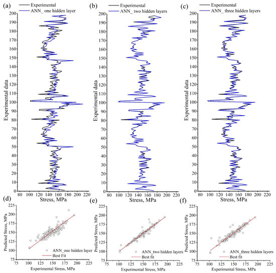 Experimental stress compared to the predicted stress of the ANN model with (a,d) one layer, (b,e) two hidden layers, and (c,f) three hidden layers.