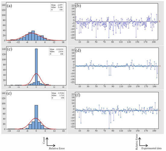 Figure 10 shows the relative error histograms and relative error plots of the predicted stress using one, two, and three hidden layers. The relative errors of the predicted stress obtained by two hidden layers were distributed about zero with the lowest standard deviation (SD) of 2.636 (Figure 10c). The distribution of the relative errors of the predicted stress obtained by the one hidden layer was the widest, with an SD of 5.458 (Figure 10a). In comparison, relative errors of the predicted stress obtained by the three hidden layers (Figure 10e) were narrowly distributed compared with those of one layer and wider than those of two layers. The relative error of the predicted stress using two hidden layers ANN model was lower than that of the other used models, namely, one- and three-layers ANN models (Figure 10b,d,f).