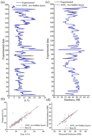 Experimental data compared to the predicted data of the ANN model with two hidden layers (a,b) elongation to failure, %, and (c,d) hardness, HB.
