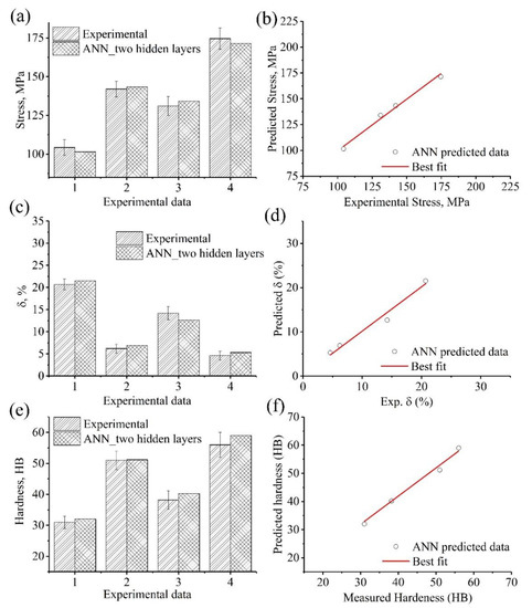 The mechanical properties, ultimate tensile strength, elongation to failure, and hardness were modeled and predicted using an ANN model. It is well known that the prediction accuracy of the ANN models is significantly affected by the number of hidden layers and the number of neurons in the hidden layers [47,48,49]. The BPANN may not accurately predict when the number of hidden layer neurons is insufficient. However, the more hidden layer neurons there are, the longer the training process will take. A sufficient number of hidden layer neurons should be used to compromise prediction accuracy and training duration. In this work, the minimal MSE was obtained when using two BP network hidden layers with 20 neurons (Figure 7 and Figure 9). It was observed that the relative error of the predicted stress using a two hidden layer ANN model was lower than that of one- and three-layer ANN models. The distribution of the relative errors of the predicted stress about the zero obtained by the two hidden layers was narrower than that of one- and three-layer ANN models. Since the ANN model with two hidden layers has proven its efficiency in predicting the stress, it was also used for predicting the elongation to failure (%) and the hardness (HB).