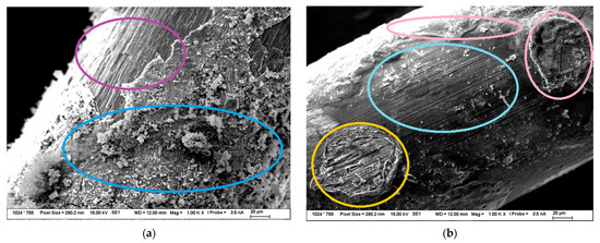 The SEM image of the surface of steel fiber treated in HCl can be seen in Figure 5b. Some grooves can be clearly seen in the center of the image (turquoise circle). This indicates that there are grooves on the original surface of the steel fiber that can be possibly uncovered, although there is still some brass left on the fibers. The formation to the left of the image could indicate this as there are grooves on the fiber (orange circle), but the EDS analysis indicated Cu and Zn. However, this changes when speaking of the formations in the image that can be seen on the upper part and the right part (pink circles) where it was found out by EDS analysis that the constituents are only Fe and O, which indicates that those formations are only made of rust products present on the fiber.