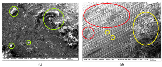 SEM image of fibers treated in NH3/H2O2 can be seen in Figure 5d. The grooves on the original surface of the steel fiber can be clearly seen in the image. They look deeper than the grooves on the surface of the fiber treated in HCl, and they are likely to contribute to the enhanced mechanical properties of the composites. The EDS analysis was performed on the darker spots (red circles) in the upper part of the SEM image, and it was found that they are composed of Cu. The formations in the right part of the SEM image (yellow circles) and the formations that are found throughout the image were put through the EDS analysis and it was found out that they are composed of Fe and O, so they are possibly steel corrosion products.