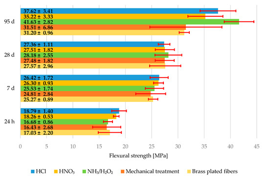 The fresh mixture was then degassed in a vacuum chamber with an agitator. The degassing was considered complete when boiling of water was observed. The composite was then quickly poured into the molds. The composites were poured into the molds perpendicularly to the length of the sample. This leads to most of the fibers being preferably oriented along the length of the specimens. No special technique was employed to ensure an even distribution of the fibers. The molds were then vibrated for 30 s, and 18 specimens with dimensions of 40 × 40 × 160 mm of reference composite, composite with fibers from NH3/H2O2, composite with fibers from HCl, composite with fibers from HNO3, and composite with mechanically treated fibers were made. The specimens were demolded after 24 h, and the testing of mechanical properties was done after 24 h, 7 days, 28 days, and 95 days. The specimens for mechanical properties testing after 7 days, 28 days and 95 days were stored under water with average temperature of 18 °C. The whole experimental scheme can be seen in Figure 1.