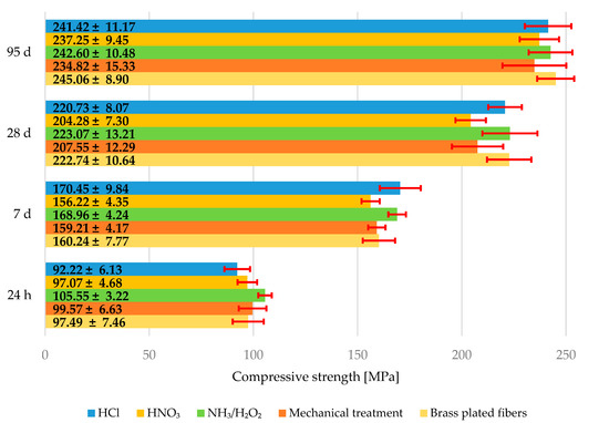 The average values of compressive strength can be seen in graph in Figure 8. The error bars represent the standard deviation. There is a slight reduction in the compressive strength of composites with HNO3 treated fibers and composites with mechanically treated fibers at every age. The values of compressive strength for composites with brass plated fibers, composites with fibers treated in HCl, and composites with fibers treated in NH3/H2O2 are almost the same at every age. However, this indicates that the grooves in the fibers do not contribute very much to compressive strength, although the addition of fibers alone can significantly increase the compressive strength of UHPC [6].
