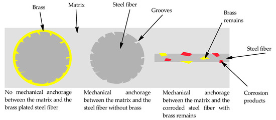 It is clear from all of the results presented above that the main mechanism with respect to the increase in flexural strength of composites with fibers treated in NH3/H2O2 is mechanical interlocking due to the formations on the surface of fibers treated in this solution. All the mechanisms discussed below are illustrated in a scheme in Figure 9. The removal of brass reveals the grooves beneath the brass on the surface of the fiber so that the matrix can penetrate them and physically secure the fiber in place. It also makes the fiber more resistant to being pulled out of the matrix. Some tiny components of the mix, such as micro silica, could also embed themselves into these grooves and serve as resistance to pulling from the fiber out of the matrix if they were able to scratch the fibers. The brass could not be removed as a whole, as seen in Figure 6, so the grooves could have been made deeper so that the overall effect of the brass removal would be greater. Mechanical interlocking regarding the remains of the brass or corrosion products on the fibers could also be considered, but this would rather serve as a weaker link between the fiber and the matrix than the grooves on the original surface of the steel fibers.